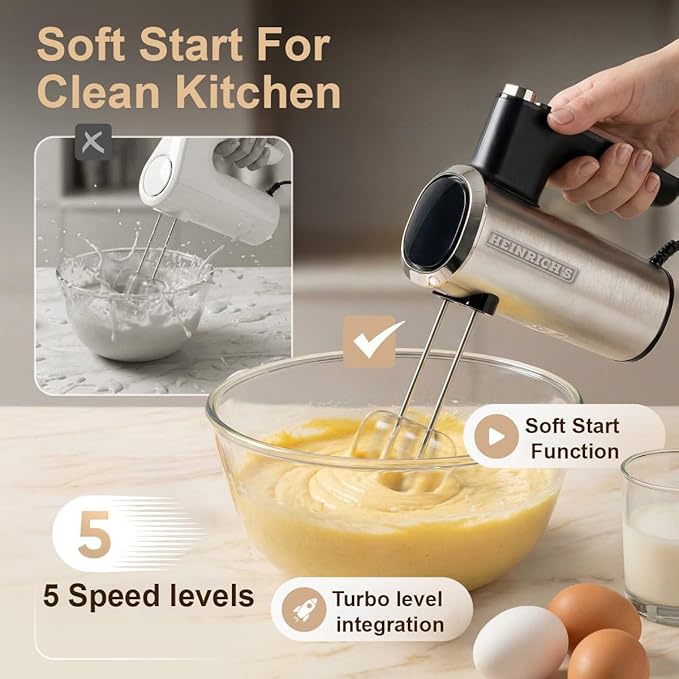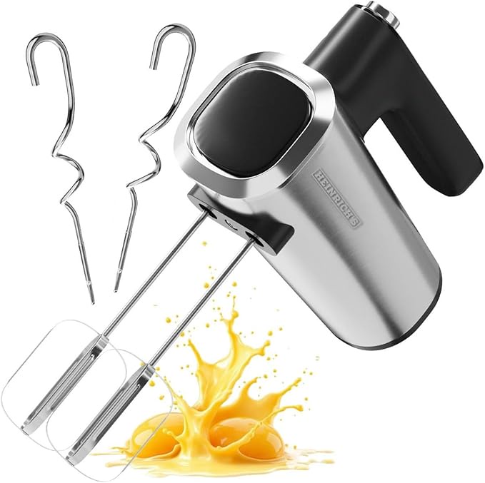 مضرب بيض Heinrich's 400W يدوي (HMM 7031). 5 سرعات وزرار Turbo. معاه ملحقات للخفق والعجن. خفيف، قوي، ومثالي للكيك والكريمة والمعجنات.
