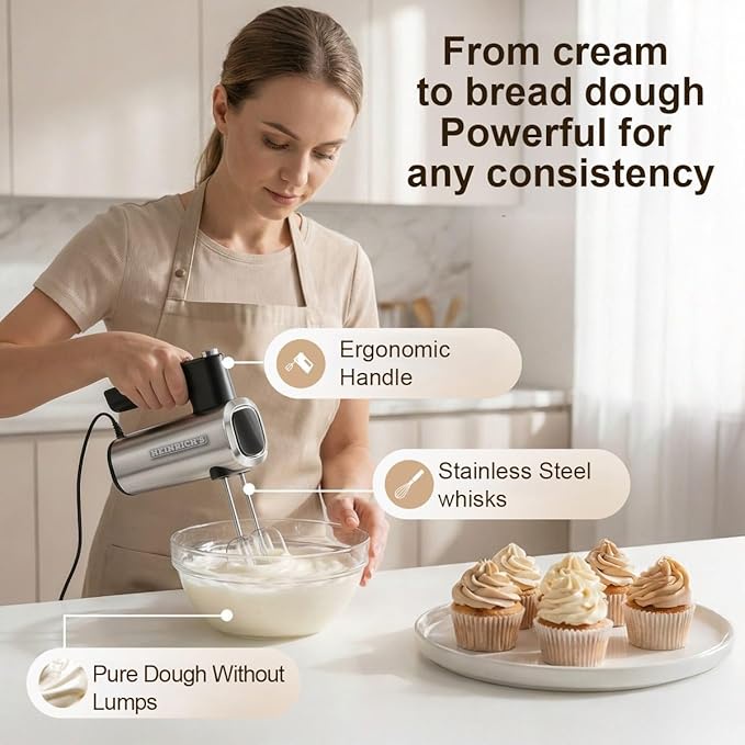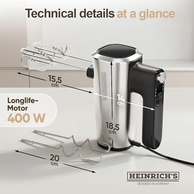 لو بتدور على مضرب بيض يعيش معاك وينجز في عمايل الكيكة والبسكوت والكريمة، يبقى مضرب Heinrich's HMM 7031 هو اختيارك الصح. المضرب ده مصمم عشان يريح إيدك (Ergonomic Design) وفي نفس الوقت يديك عزم قوي بفضل الموتور الـ 400 واط.